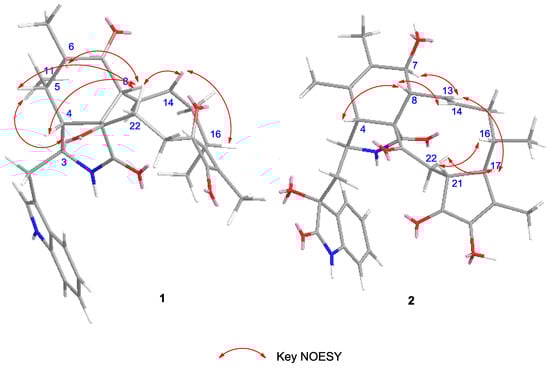 Chaetomadrasin A (1) was isolated as a white amorphous powder. The HR-ESI-MS data suggested a molecular formula of C32H36N2O5 based on the [M + Na]+ ion signal at 551.2518. The IR spectrum showed absorption bands at 3370 and 1714 cm−1, thereby implying the presence of amino and carbonyl groups. The aromatic protons signals at δH 7.51 (d, 7.0, H-4′), 7.15 (t, 7.4, H-5′), 7.22 (t, 7.5, H-6′), and 7.36 (d, 8.0, H-7′), along with an olefinic proton at δH 7.09 (s, H-2′) and a broad NH singlet at δH 8.71 (H-1′), could be assigned to a 3-substituted indolyl group. The 1H, 13C (Table 1), and HSQC (Figure S4) nuclear magnetic resonance (NMR) spectral data for 1 revealed the presence of four methyl groups, four methylene units, six methine units, one quaternary carbon, 12 olefinic and aromatic carbons, and five carbonyl carbons, which were quite similar to those of chaetoglobosin Y [20]. The main differences between the two compounds are at positions C-20, with the hydroxy substituent (C-20) in chaetoglobosin Y being replaced by the carbonyl group on C-20 in Compound 1. This conclusion is further supported by the chemical shifts of C-20 (δC 204.8) and the 1H detected heteronuclear multiple bond correlation (HMBC) (Figure S5) cross-peaks from H-21 to C-20. Further evidence for the structure of 1 was provided by its HMBC and 1H-1H correlation spectroscopy (COSY) spectra (Figure 2). In this way, the planar structure of 1 was characterized. The relative configuration of 1 was established by nuclear overhauser enhancement spectroscopy (NOESY) experiment. In the perhydro-isoindolone ring, the NOESY (Supplementary Figure S6, Figure 3) correlations of 11-Me/H-3, H-4/H-8, H-4/H-10a, H-5/H-8, and H-6/H-8 implied that H-3, 11-Me, and 12-Me are α-oriented, while H-4, H-5, H-6, and H-8 are β-oriented. Furthermore, NOESY correlations from H-14 to H-8 and H-16 suggested that H-14, H-8 and H-16 were cofacial and β-oriented. Furthermore, the large coupling constant of H-8/H-13 (J8,3 = 15.1 Hz) suggested that H-13 should be α-oriented.