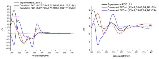 Experimental and calculated ECD spectra of Compounds 1 and 2.