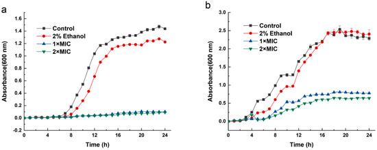 As shown in Figure 1, bacterial growth in the control groups followed the model s-shaped growth curve in general. Brochothrix thermosphacta and P. fluorescens reached the logarithmic phase after 7 and 5 h, respectively, and then stationary phase after 17 h. When 3-carene was added to the medium, B. thermosphacta stopped growing (Figure 1a) and P. fluorescens grew slowly (Figure 1b). The bacteria grew slowly when 3-carene was added to the medium. When grown in media containing 3-carene at 1× MIC and 2× MIC, the OD600 of B. thermosphacta and P. fluorescens was critically lower than the control groups in each growth phase.