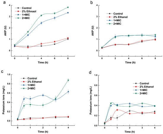 Alkaline phosphatase (AKP) activity of bacteria before and after 3-carene treatment: (a) B. thermosphacta, (b) P. fluorescens. Relative amount of potassium ions released by bacteria treated with 3-carene: (c) B. thermosphacta, (d) P. fluorescens.