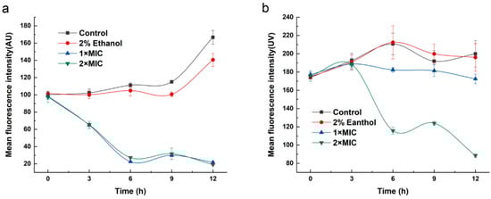 Fluorescein diacetate (FDA), an uncharged lipid molecule that does not fluoresce, can easily pass through the cell membrane where it is hydrolyzed into fluorescein by an enzyme and remains in the cell, emitting yellow-green fluorescence due to the polarity of fluorescein [24]. The loss of fluorescein molecules leads to a decrease in FDA fluorescence intensity, while the cell membrane is destroyed [25]. Therefore, the integrity and permeability of bacterial cell membranes can be reflected by changes in FDA fluorescence intensity. The fluorescein remaining on the cell membrane may be up-taken by FDA and then undergo intracellular hydrolysis by esterase to release free fluorescein [26]. Therefore, this method can also be used as an indicator of cell viability and metabolic activity of bacteria [27]. As shown in Figure 3a, the fluorescence intensity of untreated B. thermosphacta increased over time, while with the addition of 3-carene (1× MIC and 2× MIC), the fluorescence intensity significantly decreased almost 7 fold in the control groups after 12 h, indicating that the structure of the cell membrane in B. thermosphacta was destroyed by 3-carene. For P. fluorescens (Figure 3b), there was little diversification in the fluorescence intensity of the control groups, while a significant decrease (1 fold and 2 fold the control groups) occurred when the cells were treated with 3-carene (1× MIC and 2× MIC). Moreover, a greater reduction in fluorescence intensity was observed along with an increase in the concentration of 3-carene from 1× MIC to 2× MIC, indicating that the serious damage of the P. fluorescens cell membrane may be caused by the increase in the 3-carene concentration.