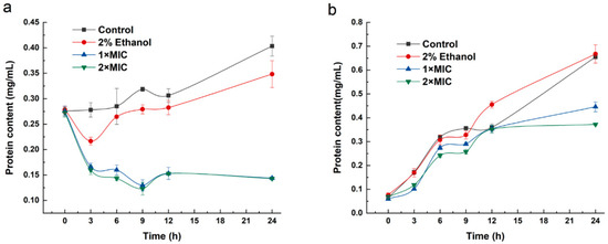 The effect of 3-carene on the intracellular protein contents of B. thermosphacta and P. fluorescens is shown in Figure 5. The protein contents of both untreated cells increased with the growth of bacteria and reached a maximum value after incubation for 24 h. The intracellular protein concentration of 3-carene-treated B. thermosphacta significantly decreased (p < 0.05) (Figure 5a). The variation in protein contents of P. fluorescens with the addition of 3-carene was similar to the control groups in 0–12 h. The protein contents of treated groups (1× MIC and 2× MIC) were 0.45 and 0.37 mg/mL, whereas the content of the control groups was almost 0.65 mg/mL after incubation for 24 h (Figure 5b).
