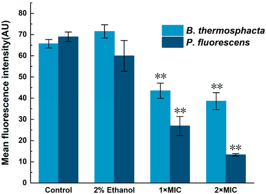 The results of the bacterial MP analysis were expressed as the mean fluorescence intensity (MFI) of Rhodamine 123 (Figure 6). With the treatment of 3-carene at 1 × MIC, a dramatic decline appeared in both B. thermosphacta and P. fluorescens, with the MFI values decreasing to almost 34% and 61% compared to the control groups, respectively. Moreover, the MFI of B. thermosphacta and P. fluorescens with the addition of 3-carene at 2× MIC decreased by 41% and 80%, respectively. In addition, it also revealed that the MFI values of P. fluorescens were lower than those of B. thermosphacta when treated with 3-carene, and the MP decreased while 3-carene concentration increased.
