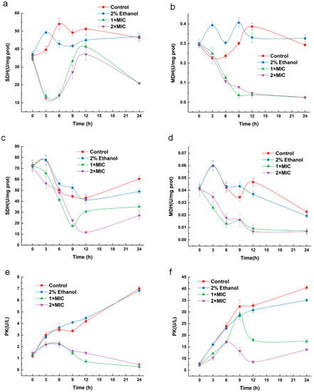 Effects of 3-carene on the activity of succinate dehydrogenase (SDH), malate dehydrogenase (MDH) and pyruvate kinase (PK) in bacteria. (a) SDH of B. thermosphacta, (b) MDH of B. thermosphacta; (c) SDH of P. fluorescens, (d) MDH of P. fluorescens; (e) PK of B. thermosphacta, (f) PK of P. fluorescens.