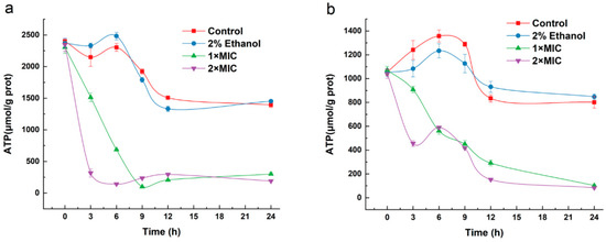 The effect of 3-carene on the ATP concentration of B. thermosphacta and P. fluorescens is shown in Figure 8. In the untreated B. thermosphacta and P. fluorescens, there was a slight increase in ATP concentrations due to the cell growth and then a slight decrease. With the treatment of 3-carene at 1 × MIC, the ATP concentration of B. thermosphacta decreased sharply from 0–10 h and then reached a steady state, while after treatment with 3-carene at 2× MIC, the ATP concentration of the cells decreased sharply within 3 h (Figure 8a). For P. fluorescens, the addition of 3-carene resulted in a decrease in ATP concentration from 0 to 24 h (Figure 8b).