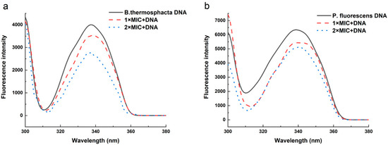 Fluorescence spectra of (a) B. thermosphacta and (b) P. fluorescens genomic DNA in the presence of increasing amounts of 3-carene. Fluorescence spectra were measured from 300 to 500 nm (k ex = 280 nm).