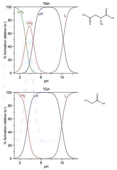 - Aragoni, M.C.; Arca, M.; Crisponi, G.; Cristiani, F.; Isaia, F.; Nurchi, V.M. Characterization of the ionization and spectral properties of mercapto-carboxylic acids. Correlation with substituents and structural features. Talanta 1996, 43, 1357–1366. [Google Scholar]