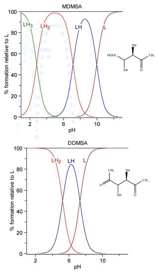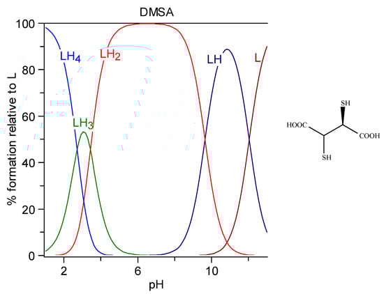 - Harris, W.R.; Chen, Y.; Stenback, J.; Shah, B. Stability constants for dimercaptosuccinic acid with bismuth (III), zinc (II), and lead (II). J. Coord. Chem. 1991, 23, 173–186. [Google Scholar] [CrossRef]