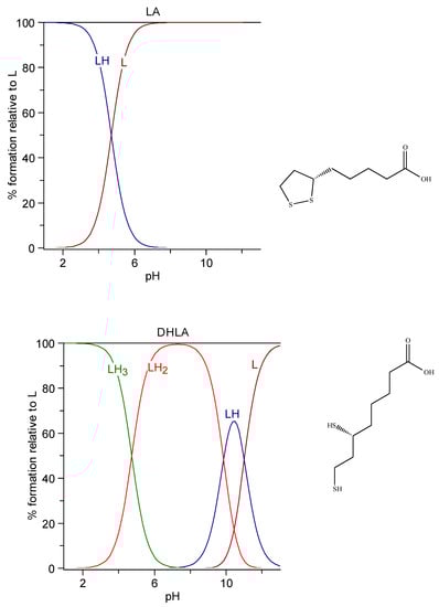 - Sigel, H.; Prijs, B.; McCormick, D.B.; Shih, J.C.H. Stability and structure of binary and ternary complexes of α-lipoate and lipoate derivatives with Mn2+, Cu2+, and Zn2+ in solution. Arch. Biochem. Biophys. 1978, 187, 208–214. [Google Scholar] [CrossRef]