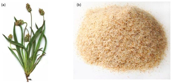 Plantago ovata (Forsk). (a) Plant; (b) psyllium husk powder.