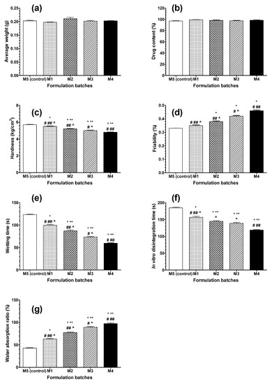 After the powder blends were compressed into tablets, the post-compression parameters of all of the prepared formulations were evaluated (Figure 3a–g).