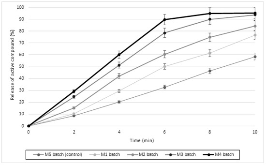 The release of meloxicam directly depended on the amount of psyllium husk powder in the prepared tablets (Figure 4). The highest meloxicam release (95.36% after 10 min) was obtained from the M4 batch tablets, which contained 16 mg of psyllium husk powder. Our results showed the lowest meloxicam release (76.68% after 10 min) from the M1 batch tablets, which contained 11.5 mg of psyllium husk powder. More than 75% of meloxicam was released after 10 min from all tablets containing psyllium husk powder (M1–M4), whereas only 58.5% of meloxicam was released from the control tablets (Figure 4). A faster dissolution rate in the presence of psyllium husk polysaccharide was also observed in the study of valsartan orodispersible formulations [26], and psyllium husk in the investigation of famotidine tablets [34]. However, the meloxicam release from MobicTM tablets (7.5 mg) with povidone as a disintegrant was reported to be 65% after 10 min, which showed a dissolution efficiency of 79.1 ± 3.24% [24]. The release of meloxicam from the optimized orodispersible meloxicam (7.5 mg) formulation with synthetic disintegrants (2% w/w sodium starch glycolate and 1.5% w/w croscarmellose sodium) in the study by Swamy et al. was 34.17% [33]. Thus, our results suggest that the demonstrated faster dissolution effect could be due to the disintegration properties of psyllium husk powder.