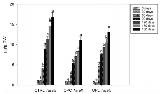 Time course of the amounts of hexanal during the storage of control (CTRL) and taralli enriched with fermented olive paste from Cellina di Nardò (OPC) or Leccino (OPL) olive cultivars at 25 °C, 500 lux, and in clear plastic bag for 180 days. Data are the mean ± standard deviation of three independent replicates (n = 3). Data were submitted to one-way analysis of variance (ANOVA), Tukey’s test was applied to compare the experimental times (0, 30, 60, 90, 120, 150, 180 days) within the same sample. Different letters mean significant difference at p < 0.05.