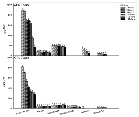 Time course of the amounts of polyphenols during the storage of CTRL and taralli enriched with fermented olive paste from Cellina di Nardò (OPC) or Leccino (OPL) olive cultivars at 25 °C, 500 lux, and in clear plastic bag for 180 days. Data are the mean ± standard deviation of three independent replicates (n = 3). Data were submitted to one-way analysis of variance (ANOVA), Tukey’s test was applied to compare the experimental times (0, 30, 60, 90, 120, 150, 180 days) within the same sample for each compound (hydroxytyrosol, tyrosol, verbascoside, isoverbascoside, oleacein, and oleocanthal). Different letters mean significant difference at p < 0.05.