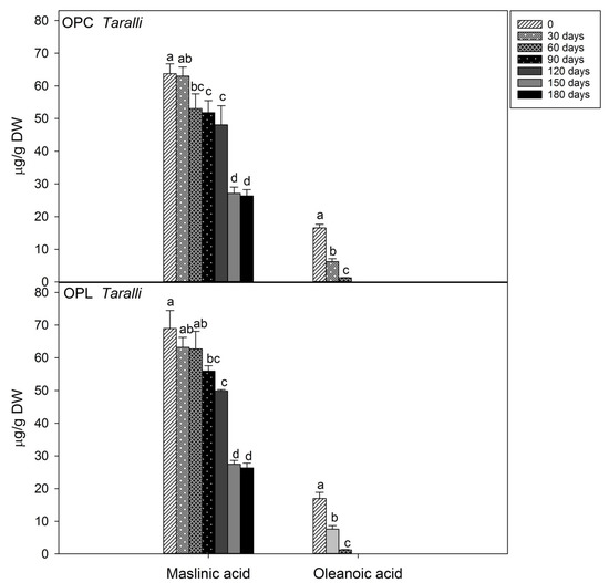 Time course of the amounts of triterpenic acids during the storage of CTRL and taralli enriched with fermented olive paste from Cellina di Nardò (OPC) or Leccino (OPL) olive cultivars at 25 °C, 500 lux, and in clear plastic bag for 180 days. Data are the mean ± standard deviation of three independent replicates (n = 3). Data were submitted to one-way analysis of variance (ANOVA), Tukey’s test was applied to compare the experimental times (0, 30, 60, 90, 120, 150, 180 days) within the same sample for each compound (maslinic and oleanoic acid). Different letters mean significant difference at p < 0.05.