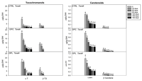 Time course of the amounts of tocochromanols and carotenoids during the storage of CTRL and taralli enriched with the fermented olive paste from Cellina di Nardò (OPC) or Leccino (OPL) olive cultivars at 25 °C, 500 lux, and in clear plastic bag for 180 days. Data are the mean ± standard deviation of three independent replicates (n = 3). Data were submitted to one-way analysis of variance (ANOVA), Tukey’s test was applied to compare the experimental times (0, 30, 60, 90, 120, 150, 180 days) within the same sample for each compound (α-T (α-tocopherol), β-T3 (β-tocotrienol), β-carotene, and lutein). Different letters mean significant difference at p < 0.05.
