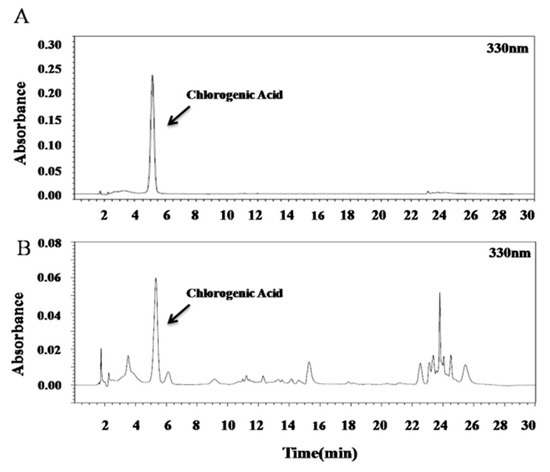 The HPLC conditions were established as follows. A gradient program was used to separate the chlorogenic acid (Table 6). Detection wavelengths were set as 330 nm. As shown in Figure 1, chlorogenic acid was identified as the main component in the extract from C. tricuspidata.