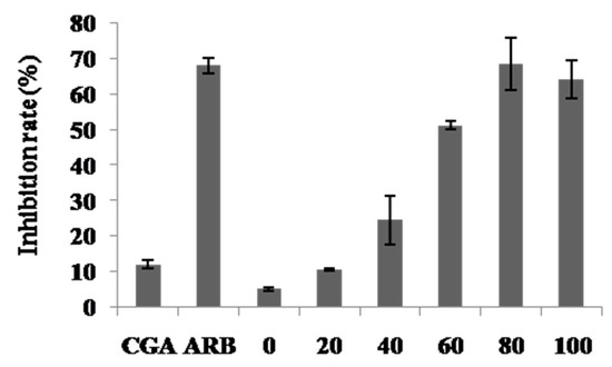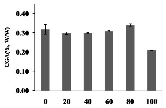 Content of chlorogenic acid (CGA) in hot water and ethanolic extracts from C. tricuspidata fruit. 0 (hot water ex); 20 (20% ethantol ex); 40 (40% ethanol ex); 60 (60% ethanol ex); 80 (80% ethanol ex); 100 (100% ethanol ex). Each value was the mean ± SD (n = 3).