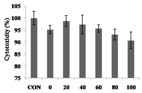 Cytotoxicity of various extracts of C. tricuspidata was determined by MTT (3-(4,5-dimethylthiazol-2-yl)-2,5-diphenyltetrazolium bromide) assay [14]. Cytotoxicity was assessed after treatment of B16F10 cells with a various sample concentration of 100 μg/mL for 24 h. For further study, 100 μg/mL or less should be considered as optimal for conducting experiments on unraveling the mechanism of action of C. tricuspidata extract (Figure 3).