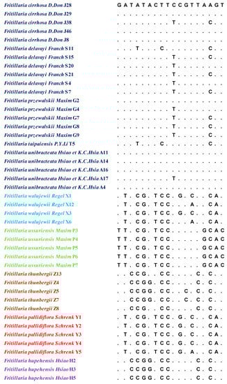 - Li, X.; Su, Y.; Li, X.; Gang, X.; Qiang, W.; Shi, J.; Wang, L.; Chen, S. Identification of Fritillariae bulbus from adulterants using ITS2 regions. Plant Gene 2016, 7, S2352407316300051. [Google Scholar]