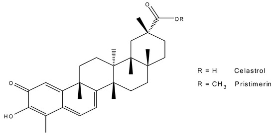- Cascao, R.; Fonseca, J.E.; Moita, L.F. Celastrol: A spectrum of treatment opportunities in chronic diseases. Front. Med. (Lausanne) 2017, 4, 69. [Google Scholar] [CrossRef]