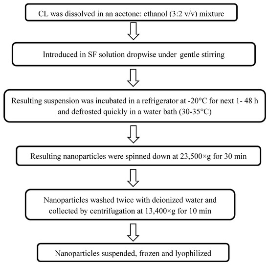 For the preparation of CL-SFNP, 0.4 mL of 2 mg/mL of CL (CL) dissolved in acetone:ethanol (3:2 v/v) was added dropwise into 4 mL of 2 mg/mL SF solution under gentle stirring at different stirring speeds of 625, 750, and 875 rpm. The addition of CL into SF solution was completed in the span of 2 min and the mixture was allowed to stir for 10 min, followed by sonication for 3 min. The suspension was then stored at −20 °C for a fixed time and quickly thawed at 35 °C. The thawed suspension was then subjected to ultracentrifugation at 14,200 rpm for 30 min. The pellet was separated and washed twice with deionized water and the nanosuspension was further dispersed by ultrasound processor set at 10% amplitude for 1 min. The suspension was then frozen at −80 °C followed by lyophilization. The lyophilized product was weighed and percent recovery was determined [17,28,29]. All the steps are shown in Figure 2.