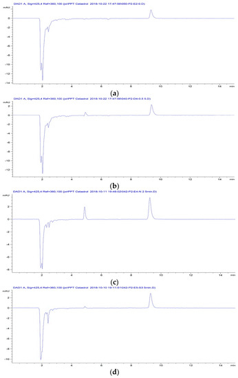 Encapsulation efficiency and drug loading was measured by Agilent 1260 infinity HPLC systems (Agilent Technologies, Palo Alto, CA, USA). Chromatographic separation was carried out on an Accucore XL C18 column (250 mm × 4.6 mm, 4 µm). Analysis was performed with UV detection, using a diode array detector (DAD) set at 425 nm for CL. The mobile phase consisted of 1% (v/v) phosphoric acid (A) and methanol (B), programmed for a gradient elution, where the mobile phase (B) increased from 58% to 95% during 4 min and remained at 95% for 8 min. The gradient elution ran at a flow rate of 1 mL/min and the acquisition time was 12 min. Encapsulation efficiency and drug loading were calculated using the following equations.