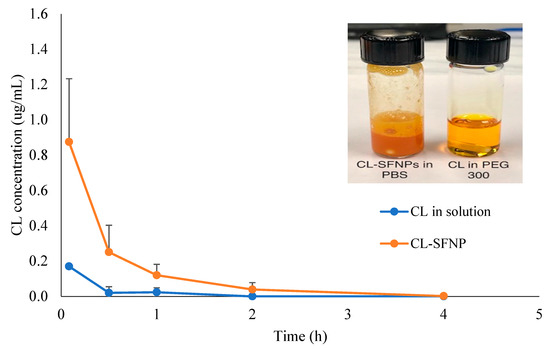 The study on animal protocol was approved by Western University of Health Sciences, Pomona Institutional Animal Care and Use Committee (IACUC). Male Sprague–Dawley rats with pre-cannulated jugular vein were administered an intravenous (IV) dose of 1 mg/kg. Rats were separated into two groups (n = 3) and were administered pure CL solution in PEG 300 or CL-SFNP suspension in phosphate buffer solution (PBS) (Figure 4) into the pre-cannulated jugular vein. After IV administration, 200 µL of blood was collected into pre-heparinized tubes at 0.083, 0.5, 1, 2, 4, 6, 8, 12, and 24 h. After 24 h the rats were euthanized with 30% isoflurane. Collected blood was then centrifuged for 15 min at 14,000 rpm. After centrifugation 110 µL of plasma was collected and transferred into Eppendorf tubes, and then stored at −20 °C until analysis. The pharmacokinetic parameters were generated by non-compartmental analysis using PK Functions for Microsoft Excel [30].