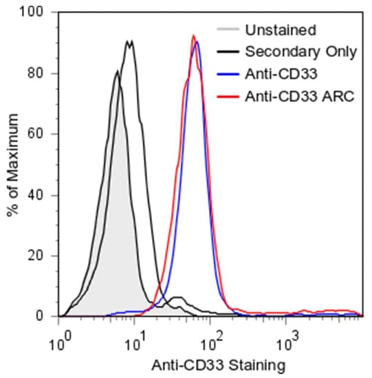 ARC Binding to THP1 Cells. Flow cytometry of mAb and ARC stained THP1 (CD33-positive) cells. Following SEC purification, mAb/ARC were applied to cells at 25 nM in FACS buffer. Secondary FITC labeled antibody was diluted 1:200 in FACS buffer. Unstained cells are represented in gray. Secondary FITC labeled antibody only is a solid black line. Anti-CD33 mAb is represented by a blue line. Anti-CD33 ARC is represented by a red line. All plots are represented as percent maximum cell count.