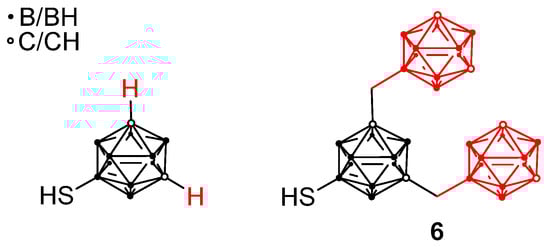 Comparison between 9-mercapto-1,7-dicarba-closo-dedecaboran(12) (left) and 1,7-bis(1,7-dicarba-closo-dodecaboran-9-ylmethyl)-1,7-dicarba-closo-dodecaboran-9-yl-thiol (6) (right) (altered fragments are drawn in red).