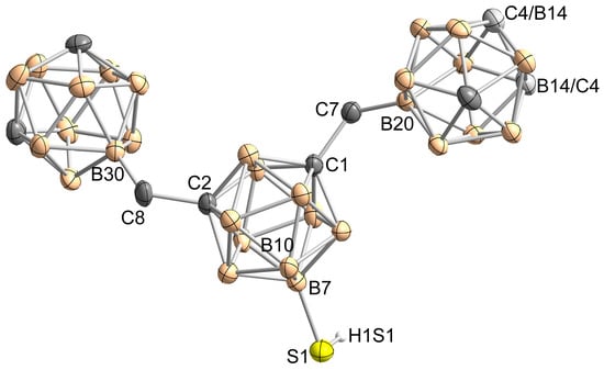 As expected, the spectroscopic data of 1,7-bis(1,7-dicarba-closo-dodecaboran-9-ylmethyl)-1,7-dicarba-closo-dodecaboran-9-yl-thiol (6) are similar to 4. In addition to the proton signals of the CH and BH groups of the carborane clusters and the CH2 signals for the bridging methylene groups, a multiplet at 0.39 ppm is observed for the thiol group in 6, comparable with 9-mercapto-1,7-dicarba-closo-dodecaborane(12) []. The molecular structure of 6 is shown in Figure 5.