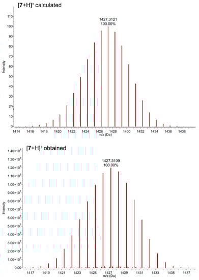 Comparison of the isotopic pattern of the calculated (top) and measured signal (bottom) of [7 + H]+ [].