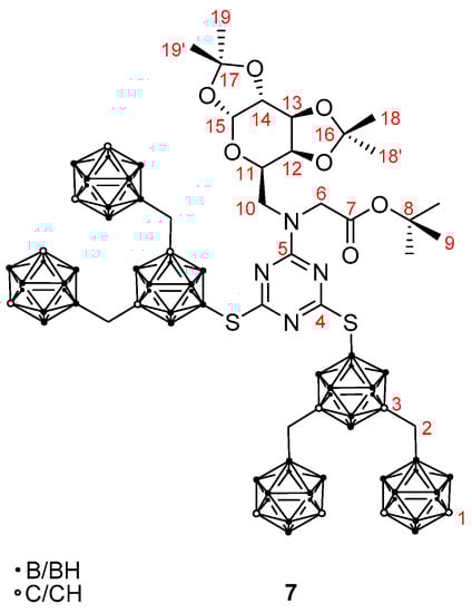Thin-layer chromatography (TLC) with silica gel 60 F254 on glass available from Merck KGaA was used for monitoring the reactions. Carborane-containing spots were visualized with a 5–10% solution of PdCl2 in methanol. For chromatography, silica gel (60 Å) with a particle diameter in the range of 0.035 to 0.070 mm, the Biotage® Isolera 1 or the Biotage® Isolera 4 automatic purification system with SNAP (particle diameter in the range of 0.040 to 0.065 mm) and SNAP Ultra (spherical particles, diameter 0.025 mm) cartridges were used. The triazine and carborane species were detected by an integrated UV/Vis detector (Isolera 1) or evaporative light scattering detector (ELSD) A-120 (Isolera 4). For chromatography, solvents were distilled before use. NMR measurements were carried out on a Bruker AVANCE III HD spectrometer with an Ascend™ 400 magnet at room temperature. Tetramethylsilane was used as internal standard for 1H and 13C{1H} NMR spectra, and 11B and 11B{1H} NMR spectra were referenced to the Ξ scale []. NMR spectra were recorded at the following frequencies: 1H—400.16 MHz, 13C—100.63 MHz, 11B—128.38 MHz. All chemical shifts are reported in parts per million (ppm). Assignment of the 1H and 13C signals was based on 2D NMR spectra (H,H-COSY, HSQC, HMQC, HMBC). Identification of the boron atom attached to sulfur was possible by comparison of the proton-coupled and -decoupled 11B NMR spectra. NMR data were interpreted with MestReNova []. NMR signals that appear as broad overlapping signals with the shape of a multiplet in either 1H, 11B{1H} or 11B NMR spectra are described as ‘br’ (broad). In this case, the superscript a is added (bra). The numbering scheme of compound 7 for assignments of NMR signals is given at the end of the experimental section (Figure 7). IR data were obtained with a PerkinElmer FT-IR spectrometer Spectrum 2000 as KBr pellets and on a Thermo Scientific Nicolet iS5 with an ATR unit in the range of 4000 to 400 cm−1. Electrospray ionization mass spectrometry was performed with an ESI ESQUIRE 3000 PLUS spectrometer with an IonTrap-analyzer from Bruker Daltonics or on a MicroTOF spectrometer from Bruker Daltonics with a ToF analyzer in negative or positive mode. Dichloromethane, acetonitrile, methanol, or mixtures of these solvents, were used as solvents for the measurements. Electron impact mass spectrometry was performed with a MAT 8230 spectrometer with a sector field analyzer from Thermo Scientific. Elemental analysis was conducted with a VARIO EL elemental analyzer from Heraeus. Melting points were determined with a Gallenkamp MPD350.BM2.5 melting point device and are not corrected.
