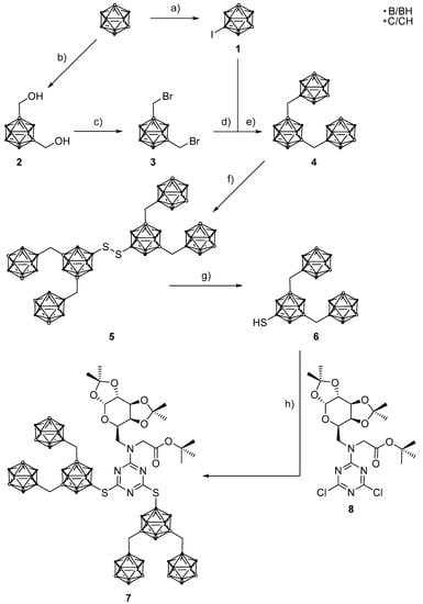 Preparation of tert-butyl-N-{4,6-bis[(1,7-dicarba-closo-dodecaboran-9-ylmethyl)1,7-dicarba-closo-dodecaboran-9-ylthio]-1,3,5-triazin-2-yl}-N-(1′,2′:3′,4′-di-O-isopropylidene-6′-deoxy-α-d-galacto-pyranos-6′-yl)glycinate (7). a) I2, AlCl3, CH2Cl2, rt, 2 d, 92% [,]; b) paraformaldehyde, n-BuLi, tetrahydrofuran (THF), rt, overnight, 89%; c) Br2, PPh3, benzene, reflux, 46 h, 95% [,,]; d) from 3—Mg, THF, reflux, 2 h; e) from 1—11 mol% CuI, 4 mol% [PdCl2(PPh3)2], THF, reflux, 2 d, 30% [,,,,,]; f) S2Cl2, AlCl3, CH2Cl2, reflux, 4 h, 67% []; g) Zn, HClconc., glacial acetic acid (HOAc), ethyl acetate, reflux, 4 h, 81% []; h) +8, K2CO3, MeCN, reflux, 2 d, 79%.