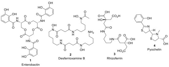 Siderophores are secreted by bacteria to the extracellular environment to solubilize and import iron, and are especially important in competitive multimicrobial environmental niches and iron-restricted host organisms. More than 500 different siderophores have now been identified with high structural diversity []. However, despite this structural diversity, the coordinating functional groups of the siderophore to chelate iron are generally consistent, including: hydroxamates, catechols, carboxylates, phenolate moieties, or indeed mixed combinations of these functional groups, attached to linear or cyclic scaffolds to form, often, a hexadentate chelate structure (Figure 1) []. Once iron is chelated in the extracellular environment, the iron–siderophore complex (ferrisiderophores) are recognized by high-affinity receptor proteins in the bacteria cell wall that utilize active transport to internalize the iron []. In Gram-negative bacteria, ferrisiderophores cross the outer membrane periplasm, and the inner membrane to reach the cytoplasm, where Fe(III) in the ferrisiderophore is reduced to Fe(II) and released; alternatively, free iron can be released from the ferrisiderophore in the periplasm for internalization to the cytoplasm [].