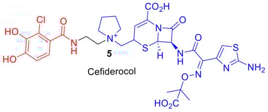 Cefiderocol, 5, is in phase III clinical trials to treat Gram-negative pathogens []. Iron chelating catechol component represented in red and the cephalosporin antibiotic component in blue.