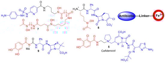 Aside from derivatives of sideromycins, examples of ‘non-natural′ synthetic or semisynthetic siderophore–antibiotic conjugates were reported as early as the 1970s (Figure 4) []. Taking inspiration from sideromycins, Zahner et al. reported a semisynthesis of sulfonamide antibiotics covalently linked to ferrioxamine B analogues; however, compound 7 displayed only a limited spectrum of activity against Gram-positive Staphylococcus aureus []. Dolence et al. reported the total synthesis of carbacephalosporin β-lactam antibiotics conjugated to tripeptides such as compound 8 attempting to mimic the iron chelating functionality of albomycin []. A hypersensitive E. coli strain to β-lactam antibiotics exhibited delayed growth in the presence of 8; the authors speculated that 8 was selecting for an iron transport-deficient mutant preventing the active uptake of 8, and hence, only delayed bacterial growth was observed. However, the study provided important proof of the principle that antibiotics not naturally present in sideromycins could be transported into bacteria. Ohi et al. reported the synthesis of catechol analogues covalently linked to ureidopenicillins []. Such conjugates, including compound 9, displayed a 30–60-fold decrease in MIC values compared to piperacillin against the opportunistic Gram-negative pathogen P. aeruginosa []. This work and related studies stimulated research into the catechol–β-lactam antibiotic conjugates in the 1980s and 1990s in academia and the pharmaceutical industry, which ultimately has led to the discovery of cefiderocol 5. A comprehensive overview of the multiple analogues of β-lactam–siderophore conjugates can be found in the recent review by Lin et al. []. Over the years, the design of siderophore–antibiotic conjugates has not drastically changed since earlier examples; conjugates consist of an antibiotic covalently attached to an iron-chelating component via a linker moiety.