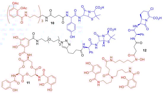 One exciting observation with regard to synthetic siderophore–antibiotic conjugates is that the siderophore component can potentially be utilized to gain lowered MIC values and selectivity for a specific bacterial species (Figure 5). Ji et al. reported the synthesis of a tris-catechol enterobactin mimic conjugated to the β-lactam antibiotic amoxicillin, conjugate 10 []. Conjugate 10 demonstrated enhanced potencies against Gram-negative bacteria and in particular against P. aeruginosa over other Gram-negative bacterial species. Acetyl groups were installed on the catechol hydroxyl groups in the siderophore component of 10 to act as a pro-drug preventing catechol metabolism and modification in vivo. Interestingly, although conjugate 10 exhibited selectivity for P. aeruginosa strains, one P. aeruginosa clinical isolate strain, known as PA6, was not susceptible to 10. This finding suggests that the PA6 strain may utilize a modified iron uptake system to other P. aeruginosa strains, or alternatively may overexpress beta-lactamases, rendering the antibiotic in the conjugate ineffective. A ciprofloxacin conjugate utilizing the same tris-catechol enterobactin mimic as 10, but lacking the acetyl groups and containing a differing linker, was reported by Fardeau et al. []. The conjugate by Fardeau et al. displayed only moderate antibacterial activity against P. aeruginosa, and the MIC was not significantly lowered compared to ciprofloxacin alone.