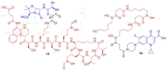 Kinzel et al. synthesized conjugates of Pseudomonas pyoverdine siderophores to ampicillin creating conjugates such as 13 (Figure 6) []. The pyoverdine conjugates, including 13, demonstrated potent antibacterial activity in the strains of P. aeruginosa from which the pyoverdines were naturally derived. Remarkably, 13 exhibited an MIC of 0.39 µM against its native pyoverdine-producing PA01 strain, which is significantly lower than its MIC values against the non-pyoverdine-producing Pseudomonas strain ATCC 27,853 (>100 µM); these conjugates are clearly utilizing the siderophore counterpart′s native iron transport mechanisms for active uptake. Conjugate 13 demonstrates, yet again, how utilizing natural siderophores can result in effective conjugates. Other synthetic pyoverdine-based β-lactam and DNA gyrase inhibitor conjugates have met with mixed results; these compounds generally exhibit reduced antibacterial activity compared to the parent antibiotic from which they were derived [,].