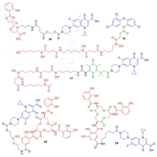 Wencewicz et al. synthesized conjugate 14, which contains a siderophore directly analogous to the natural siderophore desferrioxamine B attached to the quinolone antibiotic ciprofloxacin targeting DNA gyrase []. The conjugate did not display enhanced potency compared to ciprofloxacin alone; however, the conjugate did exhibit enhanced selectivity toward S. aureus. The authors demonstrated that only the trihydroxamate functionality, mimicking natural desferrioxamine B, was responsible for this observed S. aureus species selectivity. Desferrioxamine B is already used in patients to treat iron overload; therefore, it could be envisaged that conjugate 14 could have applications in vivo in patients with S. aureus infections. Conjugate 14 is also an example of how hydroxamate siderophores can be utilized in conjugates to gain Gram-positive species selectivity. Milliner et al. sought to gain selective antibacterial activity against S. aureus by conjugating a number of analogues of staphyloferrin A, which is a natural siderophore of S. aureus, to ciprofloxacin []. However, these conjugates exhibited reduced antibacterial potencies compared to ciprofloxacin alone, and the authors demonstrated that the functionalization of ciprofloxacin compromised DNA gyrase inhibition and proposed this to be responsible for the reduced antibacterial activity of the conjugate.