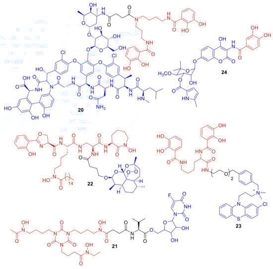 In another elegant study by Miller et al., an acetal analogue of the antimalarial agent artemisinin was conjugated to an analogue of the siderophore mycobactin T, which is utilized by Mycobacterium tuberculosis []. The difficulty of synthesizing conjugate 22 should not be underestimated, as the synthetic route involves the synthesis of both the mycobactin T scaffold and the endoperoxide 1,2,4-trioxane ring of artemisinin. The biological results were also impressive; the attachment of mycobactin T appeared to convert artemisinin from an exclusively antimalarial agent into a dual potent anti-tuberculosis (TB) agent, with MICs ranging from 0.125–1.25 µg/L against eight differing MDR M. tuberculosis clinical isolates. The authors hypothesized that microbial Fe(III) reduction to Fe(II) leads to the conversion of artemisinin into the reduced redox state; the reduced artemisinin induces the production of oxygen free radicals that invoke antimicrobial activity. Therefore, in this case, the siderophore not only enhances delivery and uptake, but also enhances the mode of action of the antimicrobial agent. Within our group, we recently reported the synthesis of a catechol azotochelin–phenothiazine conjugate 23 []. The phenothiazine used targets membrane-localized type II NADH:quinone oxidoreductase (NDH-2), which is an ATP synthase that is important for the survival of TB and a number of Gram-positive bacterial species []. NDH-2 is also the secondary target of the antibiotic colistin against Gram-negative bacteria []. As NDH-2 is localized in the cell wall, similar to β-lactam conjugates targeting penicillin binding proteins (PBPs), we used a non-cleavable linker in our design. Alt et al. prepared the unique conjugate 24 utilizing synthetic biology rather than chemical synthesis []. Conjugate 24 contains an analogue of the DNA gyrase inhibitor clorobiocin. The conjugate utilizes TonB-dependent active transport and demonstrates enhanced antibacterial activity compared to clorobiocin in TolC efflux pump mutants. However, conjugate 24 was not as active as clorobiocin against E. coli K12; the authors suggest that, although the active uptake of 24 is increased compared to clorobiocin alone, so too is the TolC-mediated active efflux of conjugate 24.