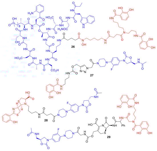 One area of siderophore–antibiotic research that has readily driven new conjugates is the desire to generate new molecules to treat Gram-negative pathogens. The additional lipopolysaccharides in their outer membranes, which are not present in Gram-positive bacteria, present a formidable barrier to the penetration and diffusion of antibiotics into Gram-negative bacterial cells []. Hence, the development of new antibiotics for Gram-negative bacteria is more challenging and of grave concern for new antibiotic discovery; for example, the new antibiotic teixobactin, 25, (Figure 9), is not active against Gram-negative bacteria []. Hence, siderophore-mediated antibiotic delivery via conjugates offers an exciting approach to turn known Gram-positive antibiotics into Gram-negative antibiotics. Using a mixed catechol and hydroxmate siderophore analogue, mimicking the natural siderophore fimsbactin of Gram-negative A. baumannii, Gosh et al. turned the Gram-positive antibiotic daptomycin into a potent killer in vitro and in vivo of A. baumannii []. The activity of conjugate 26 (Figure 10) was dependent on the iron-chelating functionalities of the siderophore, and MIC values were exhibited of 0.4 µM and 12.5 µM against A. baumannii ATCC 17,961 and S. aureus ATCC 11,632, respectively. In comparison, daptomycin alone has MIC values of 0.4 µM against S. aureus ATCC 11,632 and greater than 100 µM against A. baumannii ATCC 17961. Remarkably, the study highlighted that large antibiotics (daptomycin; 1630 Da) can indeed be functionalized for siderophore-mediated delivery. In another approach, Paulen et al. synthesized an analogue of linezolid, one of the newer antibiotics in the market, to catecholates with the aim of lowering the MICs of this Gram-positive antibiotic against P. aeruginosa []. Conjugate 27 exhibited an MIC of 128 µM against P. aeruginosa, which is significantly lower than that of linzeloid alone (>1024 µM); this is an intriguing result, as the linker was not designed to be cleavable, and linzeloid′s antibiotic target is in the cytoplasm. The activity of conjugate 26 was also enhanced in iron-deficient growth medium, suggesting the iron transportation of the conjugate.
