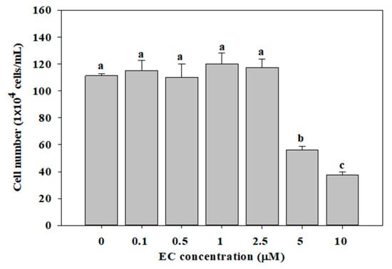 To examine the effect of EC on cell viability, we counted the number of treated BV2 cells. As shown in Figure 2, the incubation of BV2 cells with 0.1–2.5 µM EC for 24 h did not decrease cell viability within the range of concentrations used. However, the cell viability was significantly decreased at concentrations of 5 and 10 µM EC. Therefore, we used cells cultured in 0.1–2.5 uM EC for 24 h for the follow-up experiments.