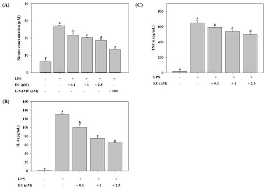 LPS is one of the immunostimulatory molecules that can activate inflammation and the production of NO in microglial cells [10,11]. As shown in Figure 3A, LPS induced a significant increase of NO levels in BV2 cells. EC significantly inhibited the LPS-induced production of NO in a dose-dependent manner, with a maximum inhibition of 31% at 2.5 µM EC, compared to the LPS-treated groups (p < 0.05). N(G)-Nitro-l-arginine methyl ester (l-NAME) was used as the positive control, and the addition of 200 µM of l-NAME significantly inhibited the LPS-induced production of NO by 51% (p < 0.05). In addition, activated microglial cells are a major source of inflammatory cytokines such as IL-6 and TNF-α, both of which can be up-regulated in various inflammatory diseases [5,11]. We analyzed the production of IL-6 and TNF-α induced by LPS using an ELISA kit. As shown in Figure 3B,C, the levels of IL-6 and TNF-α were significantly increased in BV2 cells treated with LPS (p < 0.05). However, EC significantly inhibited LPS-induced levels of IL-6 and TNF-α in a concentration-dependent manner. When EC was added at 2.5 µM, the levels of IL-6 and TNF-α were reduced to 50% (p < 0.05) and 23% (p < 0.05), respectively, as compared with those of LPS-treated group.
