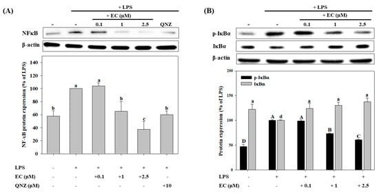 NF-κB activation is an important mediator the LPS-induced expression of iNOS in BV2 cells [30,31]. We further determined whether EC suppressed the activation of NF-κB by measuring the LPS-induced phosphorylation of IκBα (p-IκBα) in BV2 cells using western blot analysis. As shown in Figure 5, LPS significantly up-regulated the expression of the NF-κB and p-IκBα proteins. However, at 1 µM and 2.5 µM, EC significantly decreased the protein expression of NF-κB and p-IκBα in a concentration-dependent manner. The 2.5 µM EC significantly decreased the protein expression of NF-κB and p-IκBα by 70% and 39%, respectively, while QNZ decreased the expression of NF-κB by 51%, as compared with that of the LPS-treated group (p < 0.05).