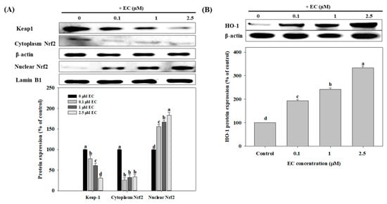 Nuclear transcription factor erythroid 2-related factor (Nrf2) is a transcription factor that regulates the coordinated expression of heme oxygenase-1 (HO-1). Nrf2 resides in the cytoplasm by forming an inactive complex with an Nrf2-inhibitory protein called Kelch-like ECH-associated protein 1 (Keap1) [30]. Thus, we next evaluated the expression of Keap1, Nrf2, and HO-1 proteins in BV2 cells. As shown in Figure 6A, EC significantly up-regulated the expression of nuclear Nrf2 protein in a dose-dependent manner (p < 0.05). Compared to the control group, EC at 0.1, 1, and 2.5 µM significantly increased the protein expression of nuclear Nrf2 by 56%, 67%, and 83%, respectively (p < 0.05). Meanwhile, although EC significantly decreased the protein expression of Nrf2 in the cytoplasm compared to the control group, the differences among the groups were not significant (p > 0.05). As shown in Figure 6B, EC significantly increased HO-1 protein expression in a dose-dependent manner (p < 0.05). Compared to the control group, the addition of EC at 0.1, 1, and 2.5 µM significantly increased the protein expression of HO-1 by 93%, 141%, and 233%, respectively (p < 0.05).