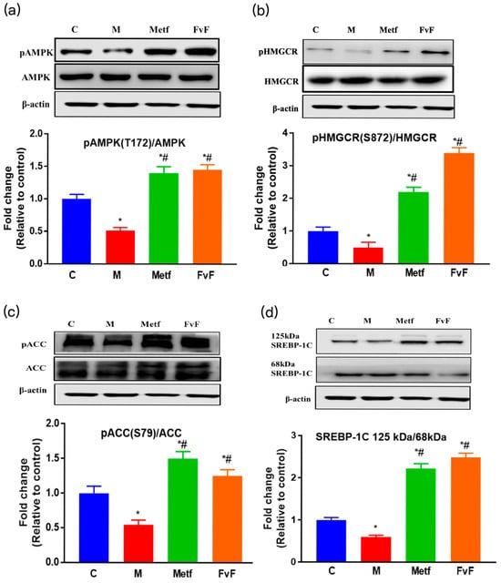 AMPK is a major regulator of lipid metabolism and serves as an intracellular energy sensor that has been implicated in lipid and glucose homeostasis [24,25]. Western blot assay was used to determine the effect of FvF on activating AMPK and regulating its downstream proteins. As shown in Figure 2a, the AMPK phosphorylation of FvF and Metf treatment groups increased compared with the model group. This was consistent with the result shown in Section 2.1.