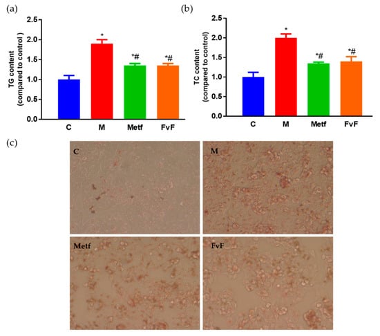 It has been confirmed that FvF increased lipid metabolism in IR HepG2 cells via AMPK-mediated regulation of ACC, HMGCR, and SREBP-1C. Furthermore, we detected the effects of FvF on the TG content, total cholesterol (TC) content, and lipid accumulation in IR HepG2 cells. The TG content of the model group was approximately 1.8 times higher than that in the control group. While, the TG contents of Metf and FvF treated groups were approximately 30% lower compared with the model group (Figure 3a). Meanwhile, FvF treatment significantly decreased the TC level compared with that of the model group (Figure 3b). Moreover, the intracellular lipid accumulation was analyzed by microscopy after staining with Oil Red O in HepG2 cells.