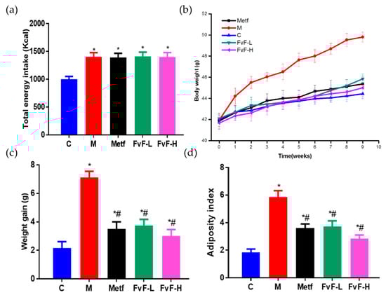 Effects of fucoidan from Fucus vesiculosus (FvF) on total energy intake, body weight gain, and adiposity index in high-fat diet (HFD) and streptozotocin (STZ)-induced metabolic syndrome (MetS) mice. (a) Total energy intake; Body weight (b) and weight gain (c) during 9 weeks feeding trail; (d) Adiposity index, calculated according to the formula: 100 × (perirenal fat pad + epididymal fat pad)/body weight. C, mice were fed a normal diet; M, mice were fed a HFD; Metf, mice were fed a HFD with 225 mg/kg/day metformin; FvF-L, mice were fed a HFD with 20 mg/kg/day FvF; FvF-H, mice were fed a HFD with 100 mg/kg/day FvF. Data are expressed as the mean ± SEM. Differences were assessed by ANOVAs and statistical results are denoted as follows: * p < 0.05 versus the control group; # p < 0.05 versus the model group.