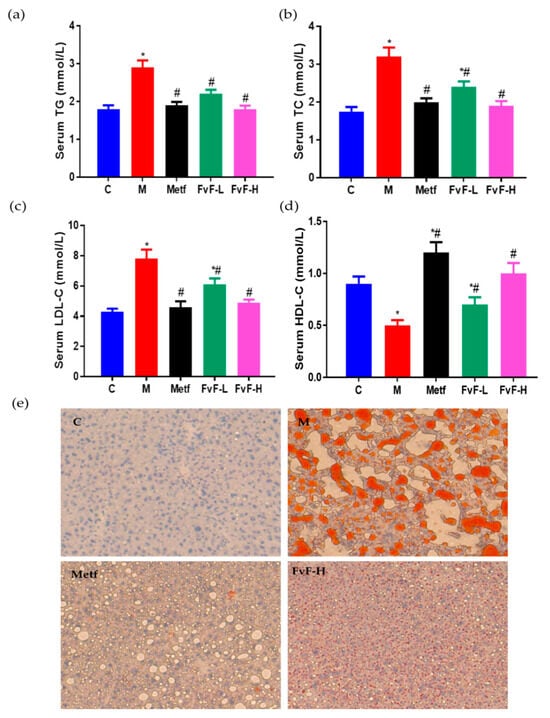 Effects of fucoidan from Fucus vesiculosus (FvF) on the serum and liver lipid profile in high-fat diet (HFD) and streptozotocin (STZ)-induced metabolic syndrome (MetS) mice. (a) Serum triacylglycerol (TG); (b) Serum total cholesterol (TC); (c) Serum low density lipoprotein-C (LDL-C); (d) Serum high density lipoprotein-C (HDL-C); (e) lipid accumulation in liver tissue characterized by Oil Red O staining (100×). C, mice were fed a normal diet; M, mice were fed a HFD; Metf, mice were fed a HFD with 225 mg/kg/day metformin; FvF-L, mice were fed a HFD with 20 mg/kg/day FvF; FvF-H, mice were fed a HFD with 100 mg/kg/day FvF. Data are expressed as the mean ± SEM. Differences were assessed by ANOVAs and statistical results are denoted as follows: * p < 0.05 versus the control group; # p < 0.05 versus the model group.